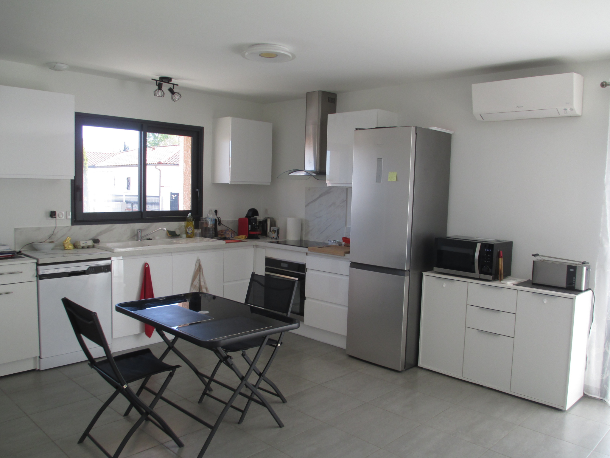 Villa de plain pied, 79 m² habitable en très bon état, cuisine ouverte sur piece de vie avez clim reversible, deux chambres, salle d'eau. Garage. Le tout sur terrain clos de 715 m².